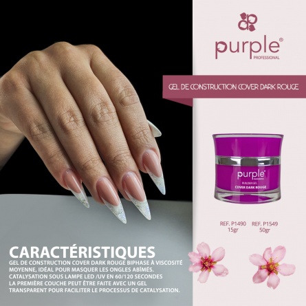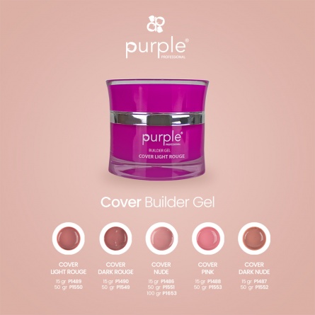 1Le COVER BUILDER GEL de Purple Professional est un gel de construction biphase à viscosité moyenne. Ce gel est un produit 2 en 1 puisqu’il s’utilise en tant que base et également en tant que gel de construction. Il s’utilise pour la construction, le modelage, le remplissage et le gainage de l’ongle tant sur ongles naturels, que sur capsules. Il vous permet également de réaliser des extensions sur chablon. Son excellente tenue peut être comparée à celle des ongles en acrylique. Sa texture auto-égalisante est facile à travailler et ne coule pas. Les Gels Cover sont idéals pour masquer et camoufler les petites imperfections des ongles abîmés. Le COVER BUILDER GEL de Purple Professional est disponible en 5 teintes : Cover Light Rouge (15 et 50 gr), Cover Dark Rouge (15 et 50 gr), Cover Nude (15, 50 et 100 gr), Cover Pink (15 et 50 gr), et Cover Dark Nude (15 et 50 gr).