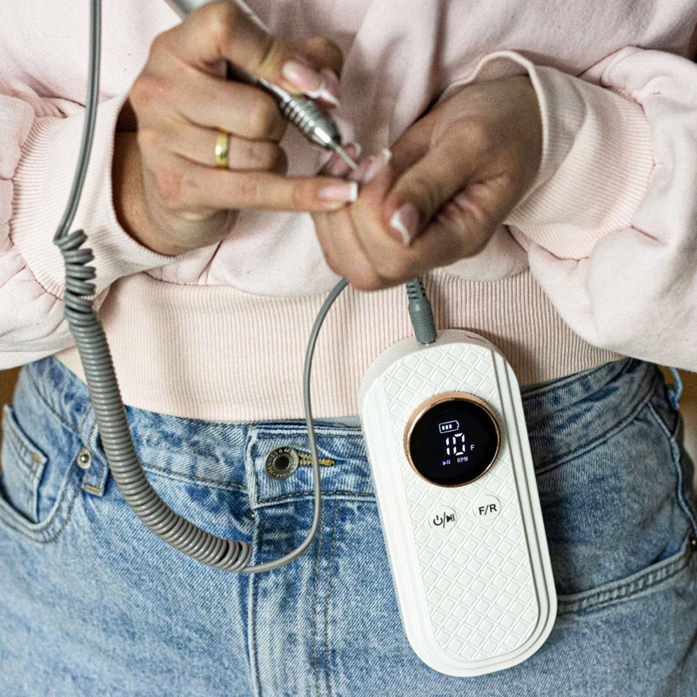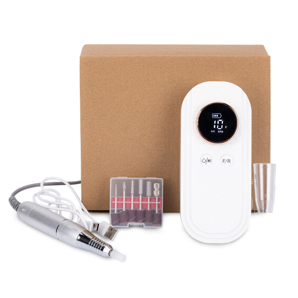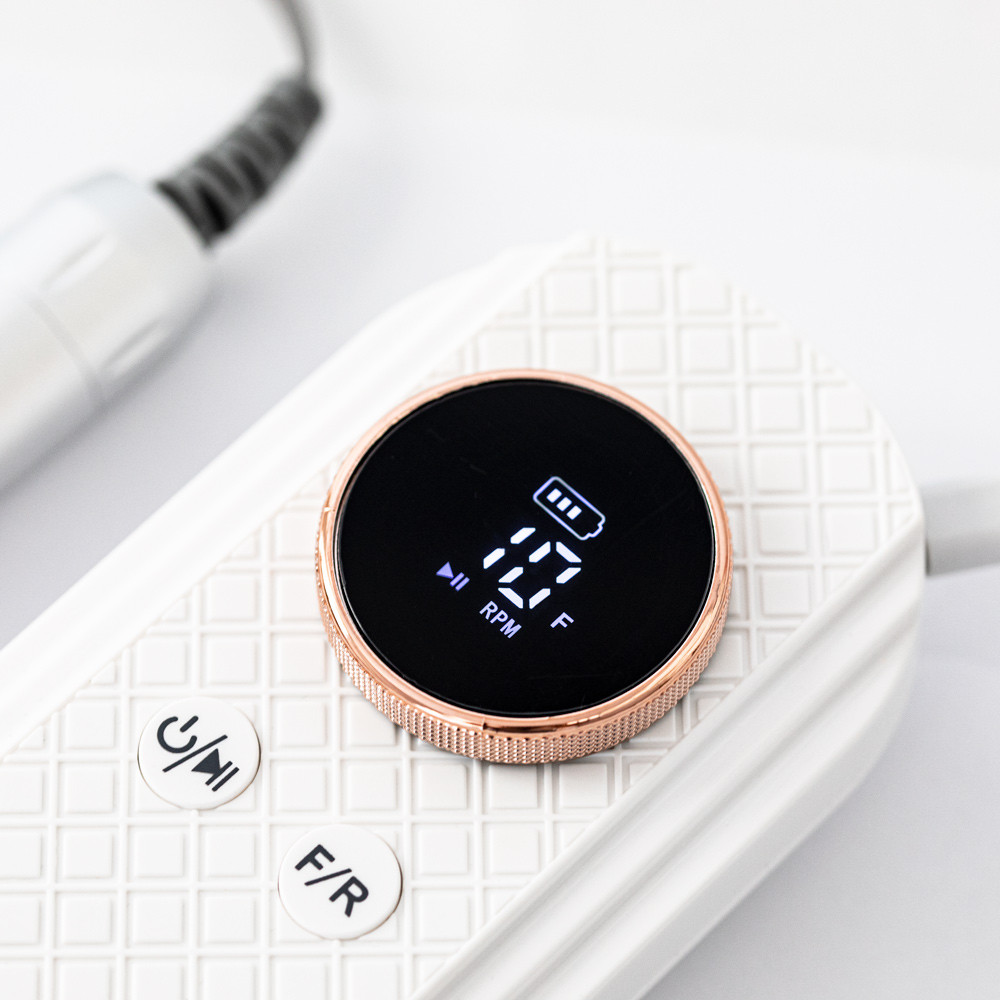 Cette ponceuse à ongles moderne et sans fil d'une puissance de 50 W est un outil fiable pour les stylistes qui apprécient le confort de travail et la mobilité. Équipée d'un écran LCD lisible qui affiche la vitesse de rotation, leur direction et le niveau de charge de la batterie, elle offre un contrôle total pendant le stylisme.